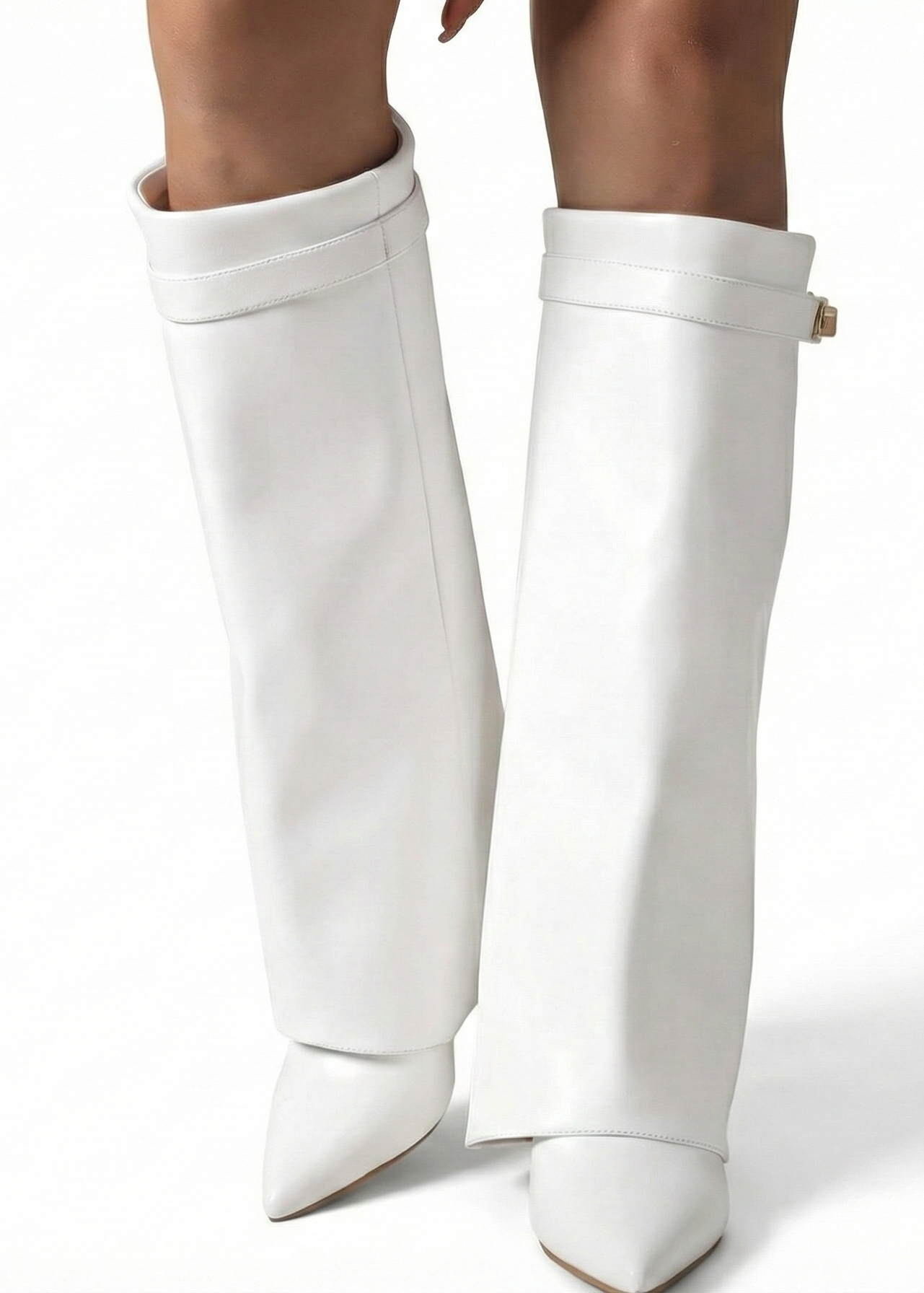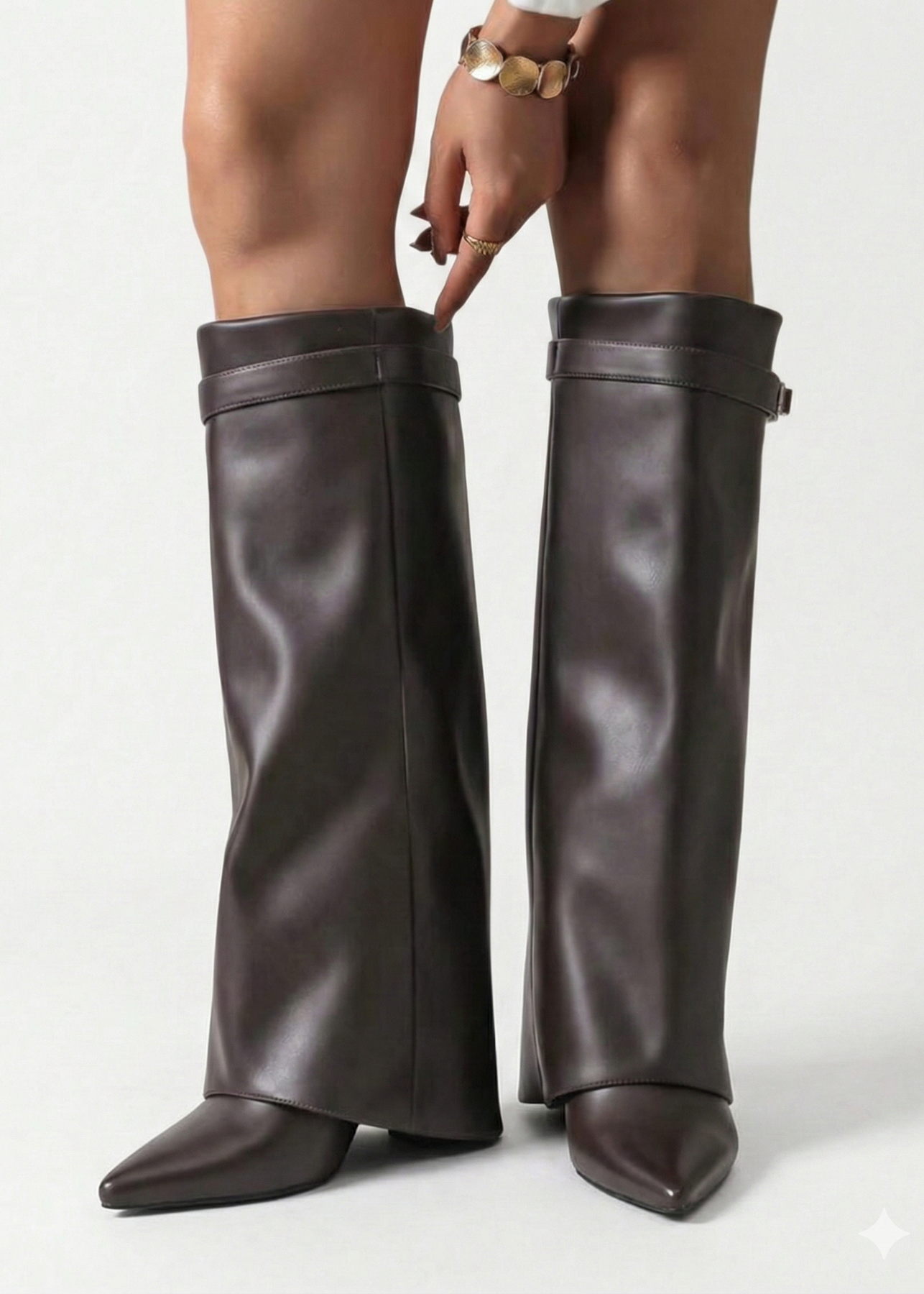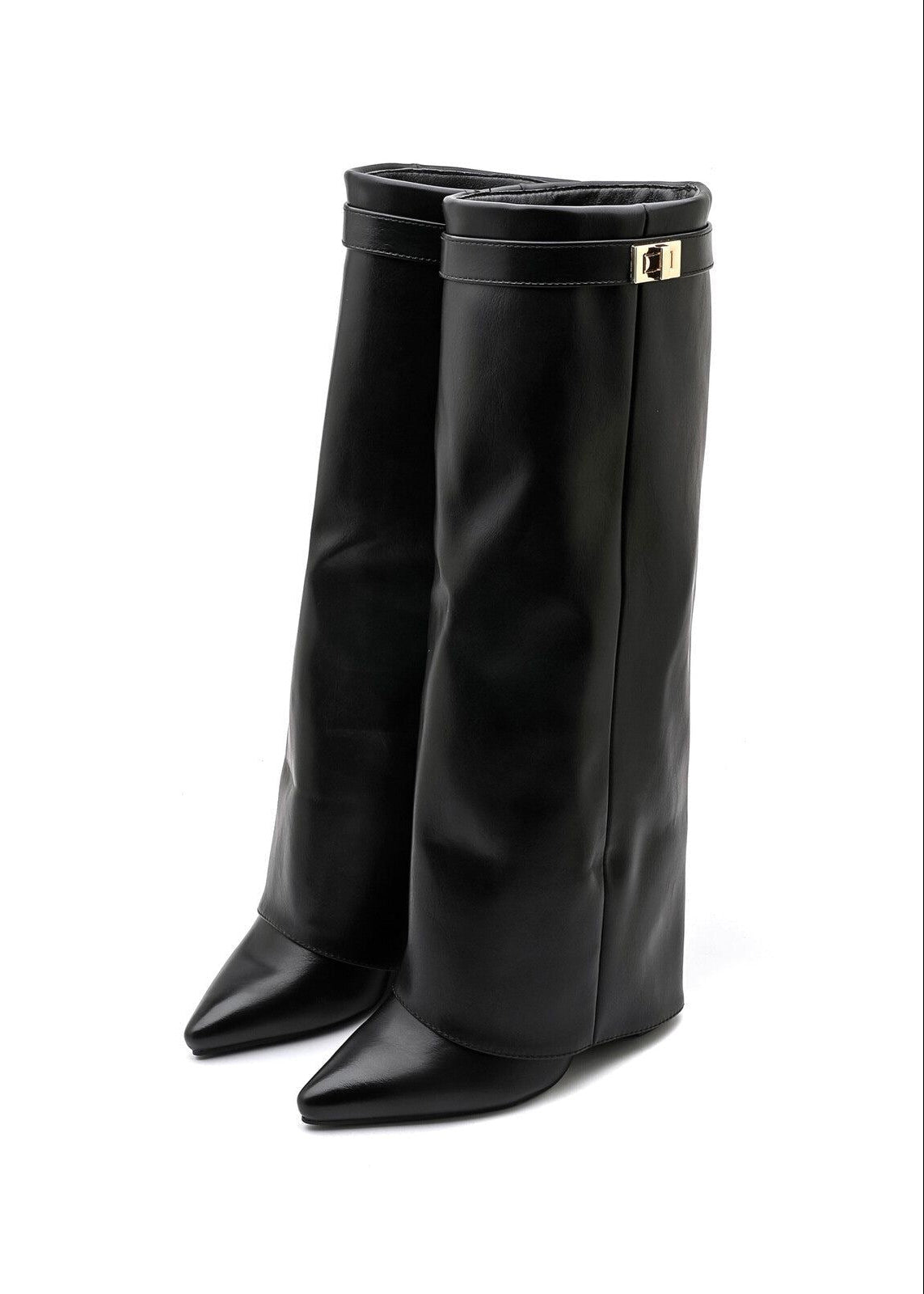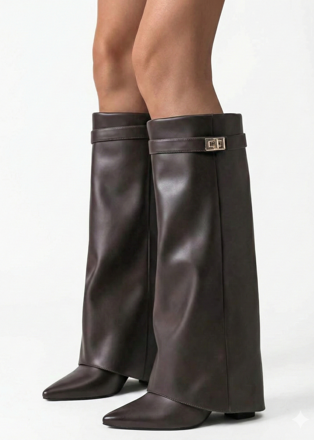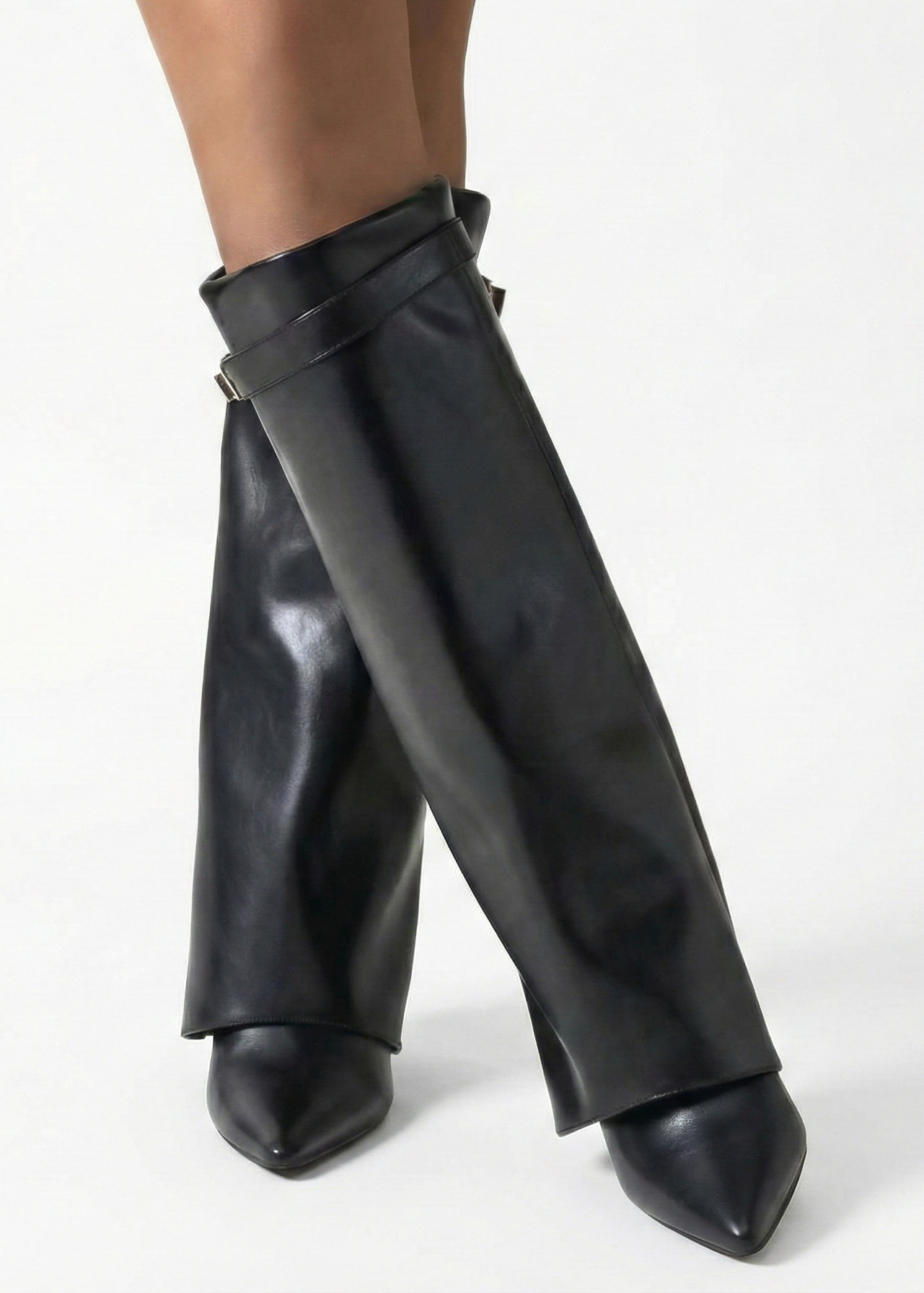 Diese kniehohen Stiefel bestechen durch ihr avantgardistisches Overlay-Design. Das markanteste Merkmal ist der weite Schaft, der wie eine Gamasche über den eigentlichen Schuh fällt und bis zum Absatz reicht.